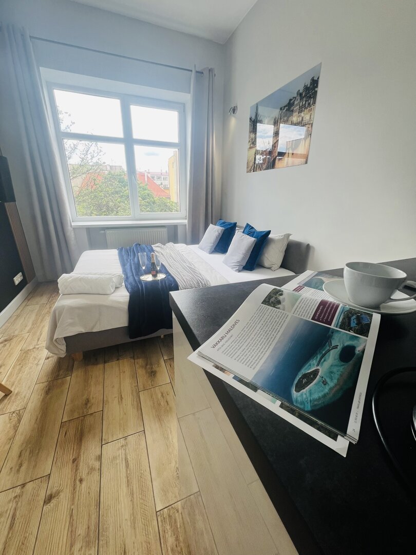 We offer a modern apartment for rent ( 22m2 ), which is located on Ruska Street in a tenement house in the very center of Wroclaw. The apartment is located on the third floor in a building whose original name was "Kamienica pod Złotymi Nożycami". It was renovated and equipped with an elevator and electronic security system. The system gives the possibility to access the apartment at any time through an access code received after paying for the reservation.