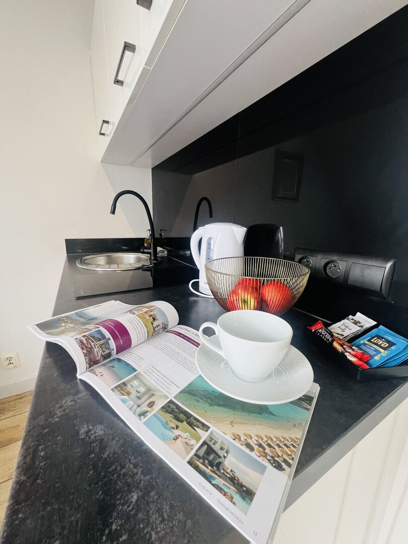 - kitchen kitchenette - along with the most necessary kitchen equipment, i.e. fridge, induction hob, electric kettle (the equipment also includes: kitchen tableware, cutlery, cleaning products and coffee or tea)