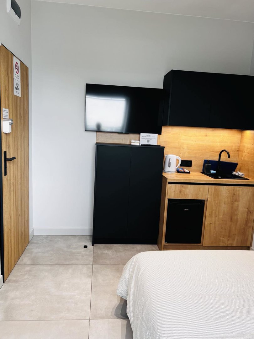 The apartment has a double bed, a dining/living area with table and chairs and a kitchenette equipped with a refrigerator, sink, electric kettle, kitchenware. A smart TV, a closet, and a set of towels and fresh linens are also at guests' disposal. The hotel room also has a private bathroom with a shower. There is a beautiful city view of the Old Town Boulevard or the Oder River.