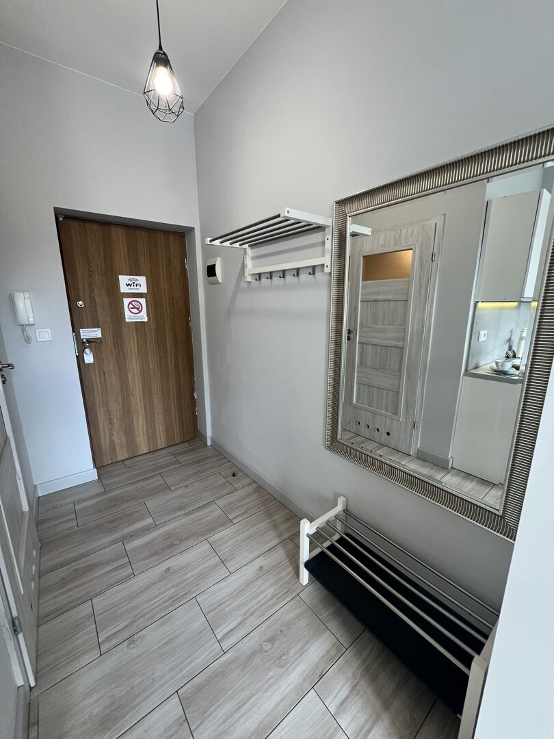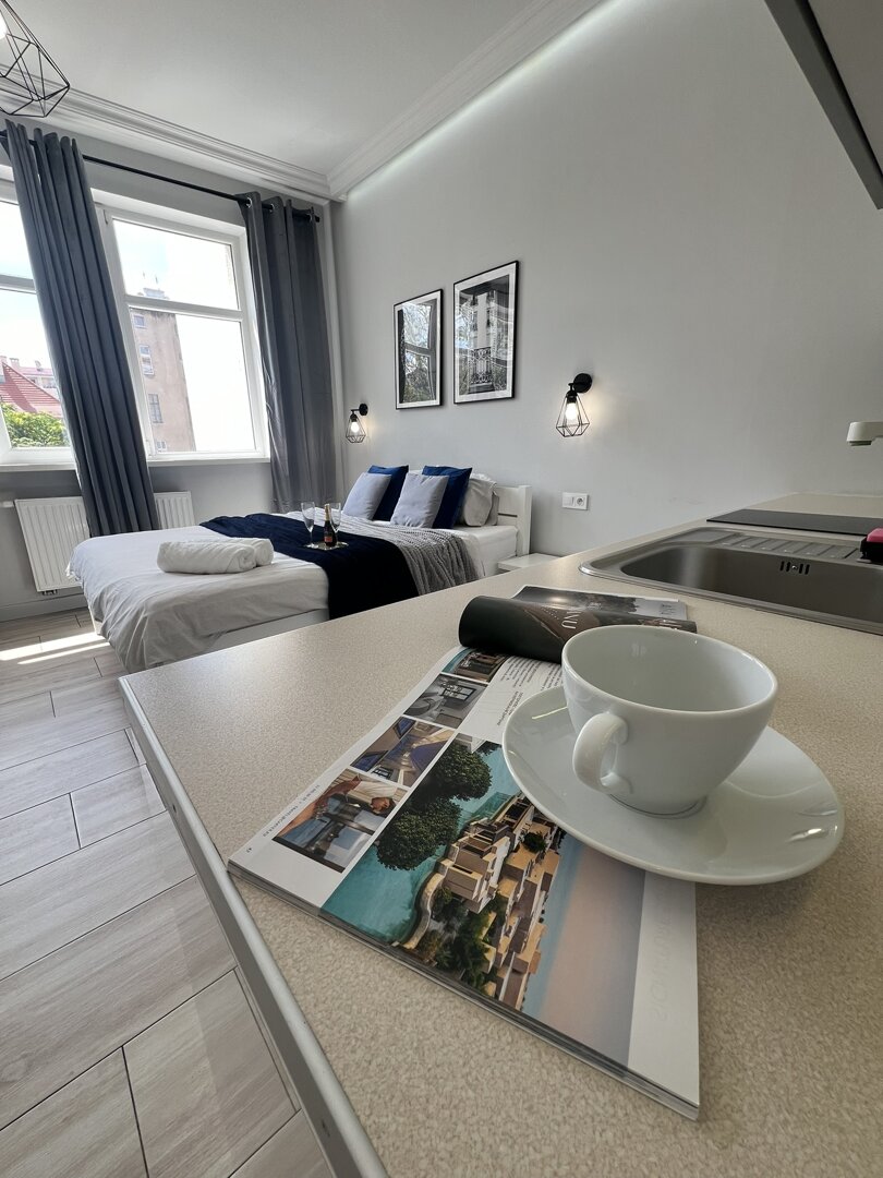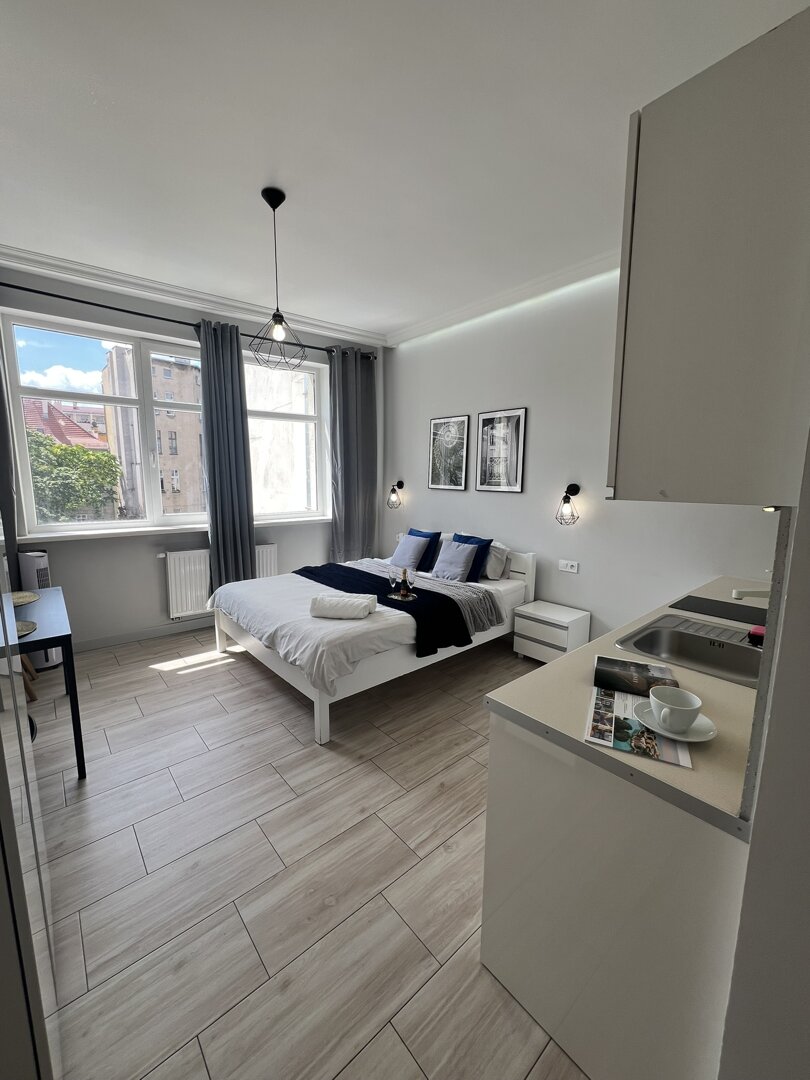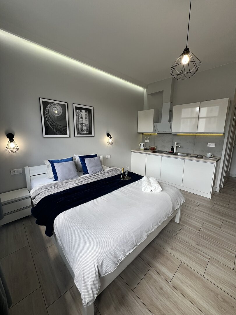 Nowoczesny oraz luksusowy apartament typu studio, urządzony w stylu soft loft o pow. 35m2. Do dyspozycji gości należy stylowo zaprojektowany apartament wyposażony w rozkładaną kanapę dla dwóch osób wraz ze stolikiem kawowym, łózko dwuosobowe, bardzo dobrz