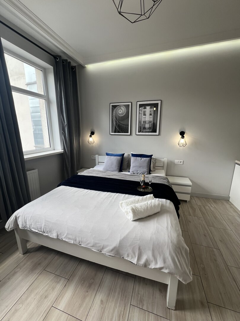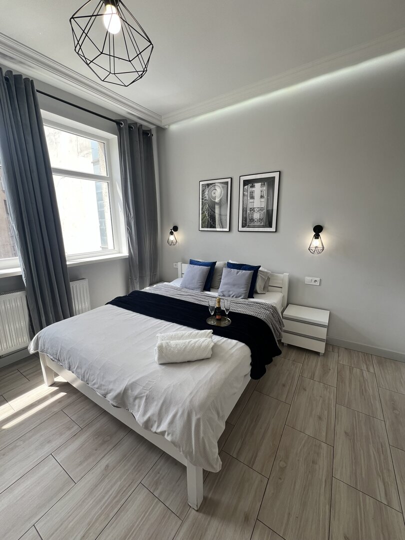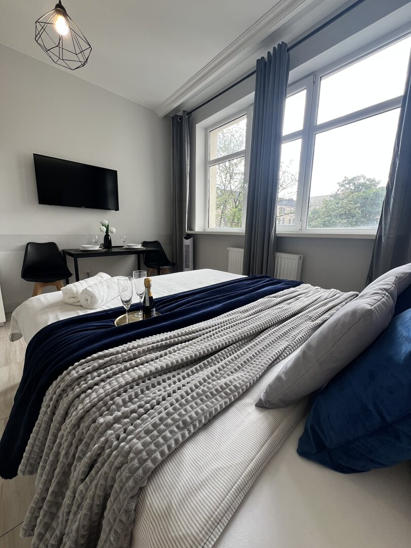Pięknie urządzony apartament w stylu soft loft przeznaczony dla 2-4 osób. Apartament idelanie nadaje się na przyjazd biznesowy jak i turystyczny. Apartament posiada duże łożko, część jadalno/wypoczynkową ze stołem i krzesłami oraz aneks kuchenny wypos